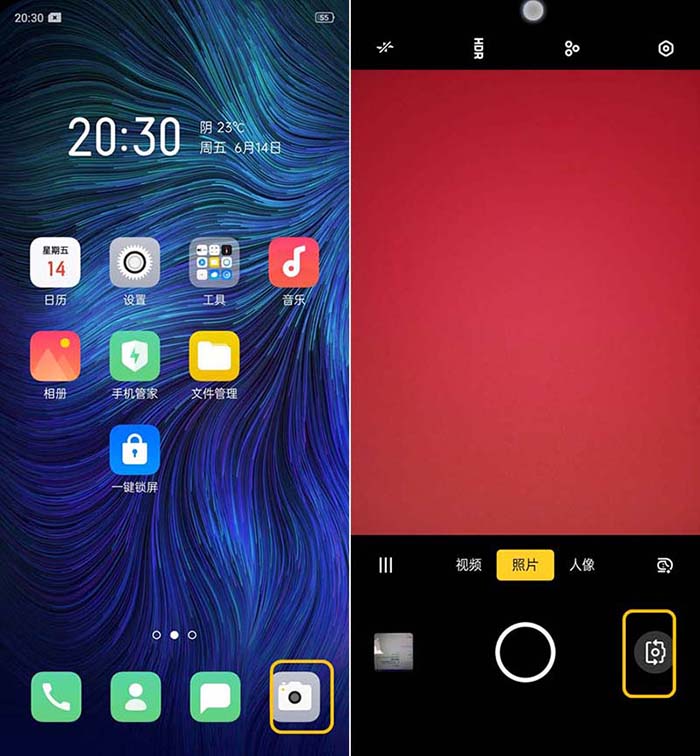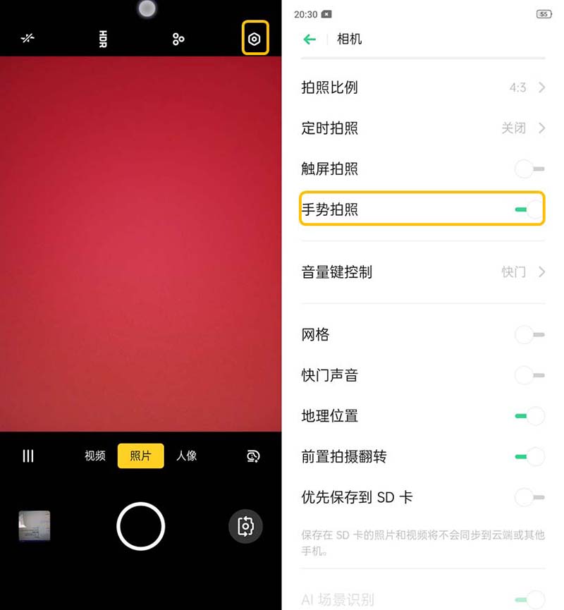2、然后點(diǎn)擊右上角的設(shè)置圖標(biāo)快捷進(jìn)入相機(jī)設(shè)置界面,開啟手勢(shì)拍照功能。