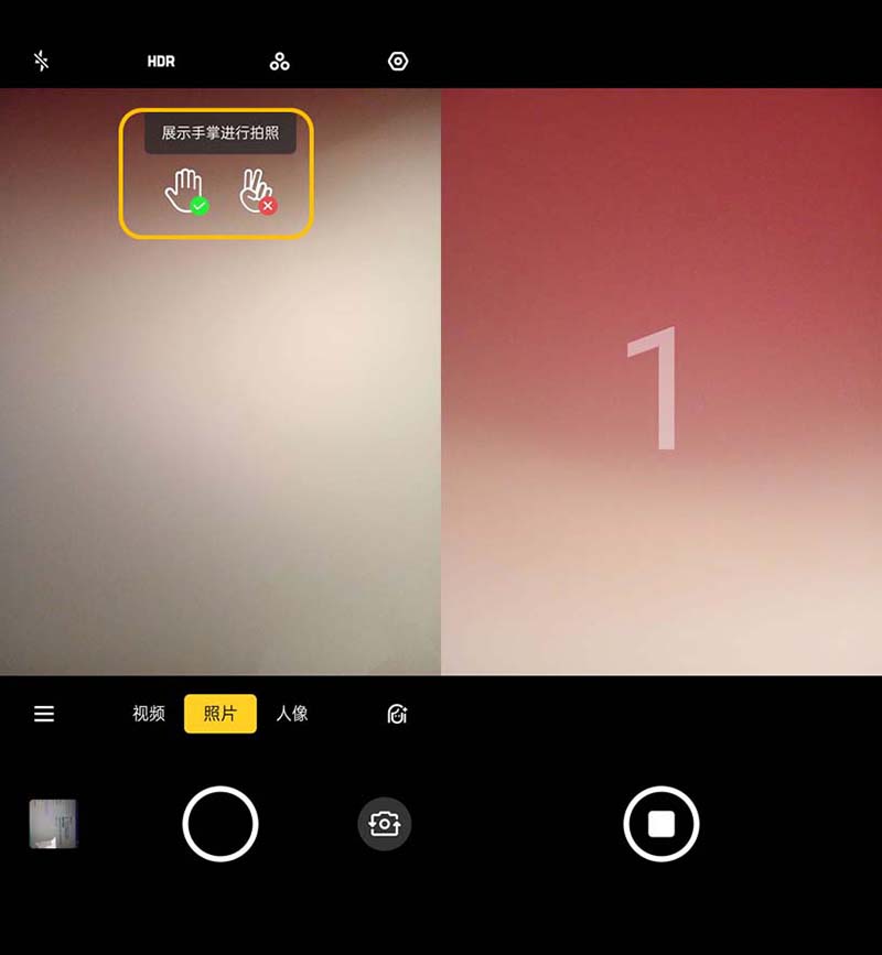 3、返回相機(jī)界面就可以使用手勢(shì)拍照功能了,首次開啟還會(huì)彈出使用介紹,在鏡頭內(nèi)展示手掌,會(huì)留有三秒的倒計(jì)時(shí)讓你擺姿勢(shì),倒計(jì)時(shí)結(jié)束后就會(huì)拍照。