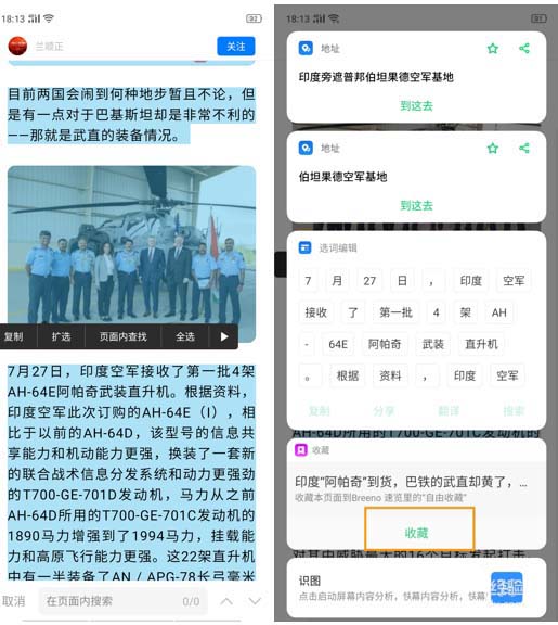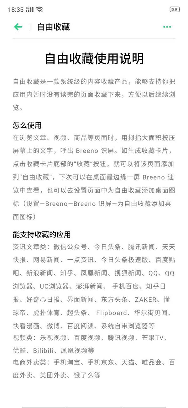2、再瀏覽文章、視頻、商品等頁面時,用拇指大面積按壓屏幕上的文字,呼出智慧識屏;如生成收藏卡片,點擊收藏卡片底部的“收藏”按鈕,就可以將該頁面添加到“自由收藏”。