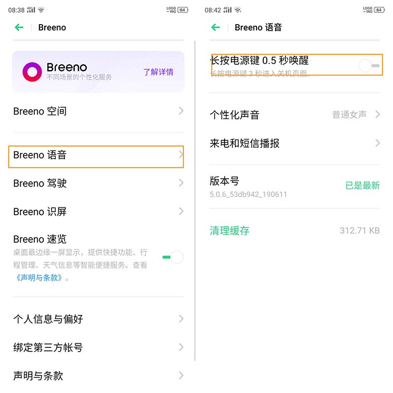 2、進(jìn)入Breeno 后,選擇【Breeno 語(yǔ)音】開啟【長(zhǎng)按電源鍵0.5秒喚醒】開關(guān),如下圖;