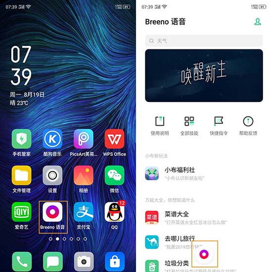 3、設(shè)置完成后,長(zhǎng)按電源鍵0.5秒即可打開Breeno 語(yǔ)音助手。也可以在手機(jī)桌面找到【Breeno 語(yǔ)音】圖標(biāo),直接打開語(yǔ)音助手,如下圖;
