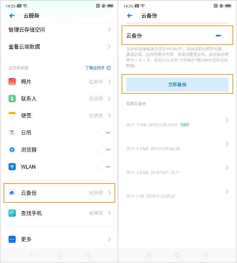 4、云備份打開后,當(dāng)手機(jī)接通電源且連接WLAN時(shí),會(huì)自動(dòng)備份您的短信、通話記錄、應(yīng)用列表與布局、系統(tǒng)設(shè)置至云端。自動(dòng)備份頻率為1天1次,您也可以點(diǎn)擊【立即備份】隨時(shí)備份您的這些數(shù)據(jù)。