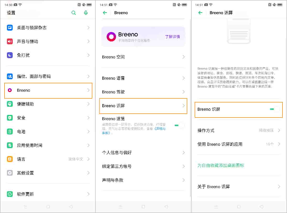 1、通過(guò)桌面的【設(shè)置】—【Breeno】—打開(kāi)【Breeno識(shí)屏】的開(kāi)關(guān)。