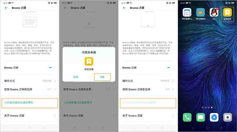 3、然后點(diǎn)擊【為自由收藏添加桌面圖標(biāo)】—【添加】—即可在桌面查看到相應(yīng)的【自由收藏】圖標(biāo)了。