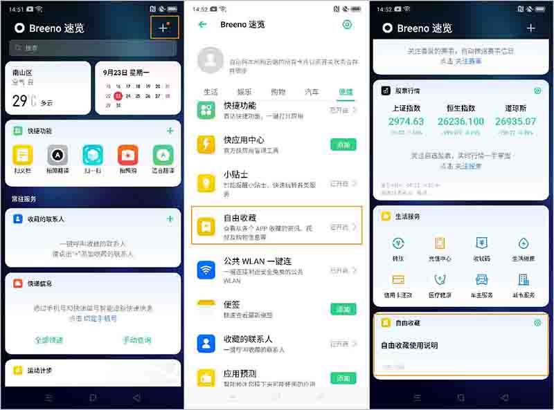 4、也可以通過(guò)【負(fù)一屏】—點(diǎn)擊右上角【+】—【便捷】—【自由收藏】進(jìn)行添加,后續(xù)在手機(jī)負(fù)一屏也可以看到相關(guān)收藏的內(nèi)容咯。