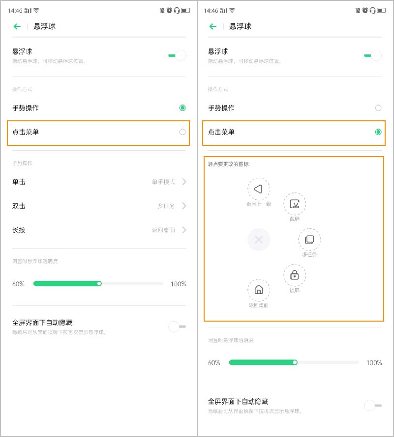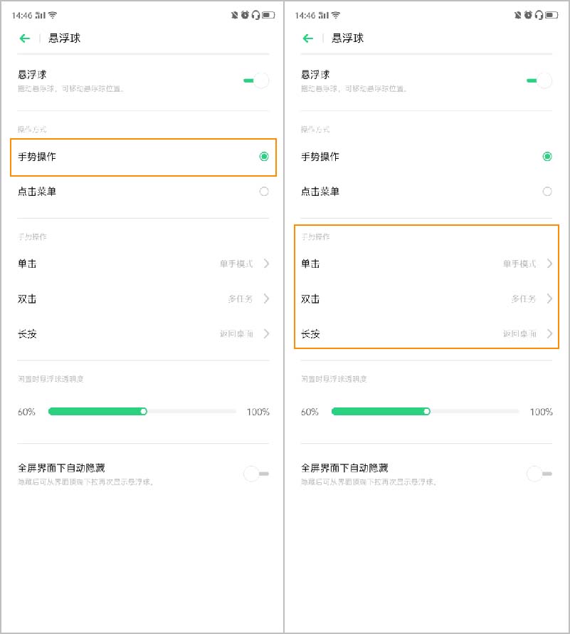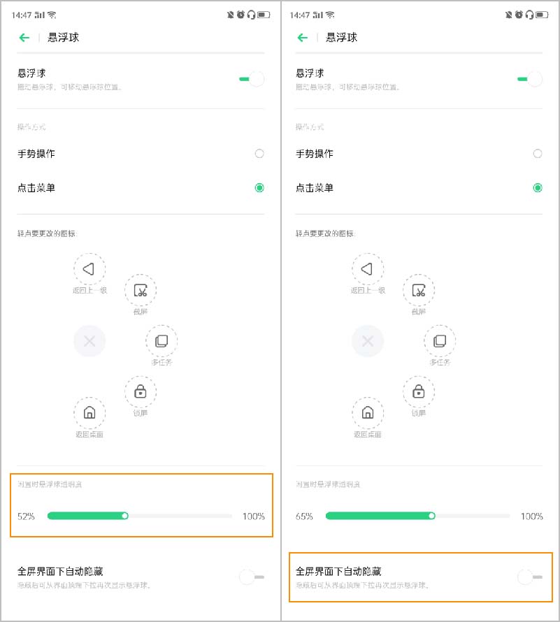 3、當(dāng)然除了操作方式,懸浮球的形態(tài)我們也可以自由設(shè)置。對于懸浮球的透明程度,也可以自由設(shè)置它的透明程度。