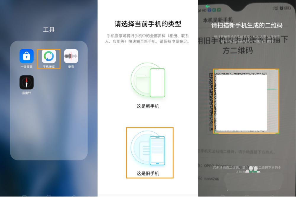 4、然后就用另外一部舊OPPO手機—從桌面工具內(nèi)找到手機搬家—選擇本機是舊手機,然后對準新手機二維碼進行一個連接過程。