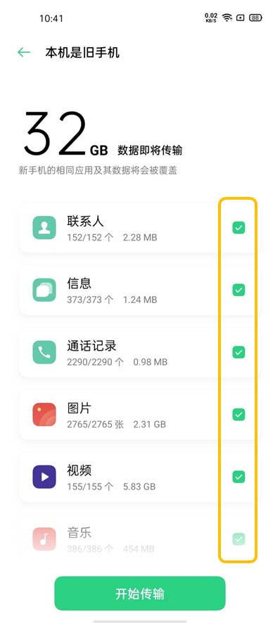 5、新舊手機(jī)連接達(dá)成后,勾選需要搬家的數(shù)據(jù),點(diǎn)擊“開(kāi)始搬家”,新舊手機(jī)即可開(kāi)始數(shù)據(jù)搬家操作。
