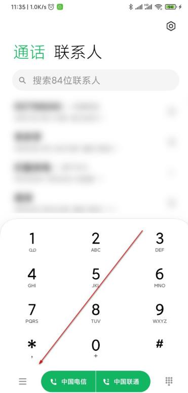 1、打開(kāi)手機(jī)的撥號(hào)界面,點(diǎn)擊箭頭指向位置。