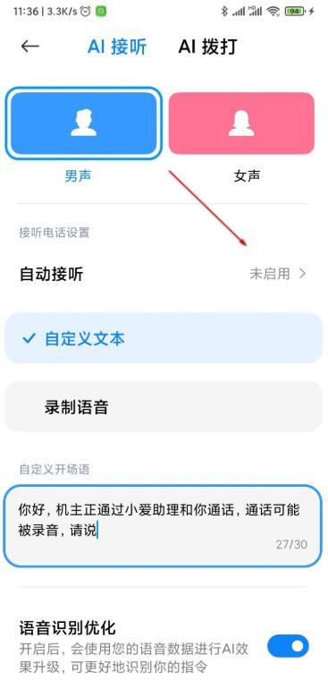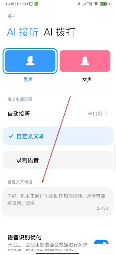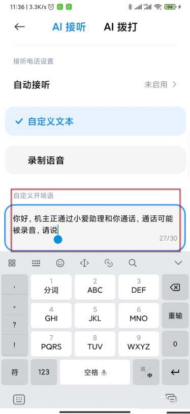 打開(kāi)手機(jī)的撥號(hào)界面,點(diǎn)擊箭頭指向位置。然后我們這里點(diǎn)擊AI通話的按鈕。此時(shí)我們點(diǎn)擊可以打開(kāi)自動(dòng)接聽(tīng)。點(diǎn)擊下方的文本,設(shè)置自定義的開(kāi)場(chǎng)語(yǔ)。這里我們就能自己設(shè)置文本作為開(kāi)場(chǎng)語(yǔ)。