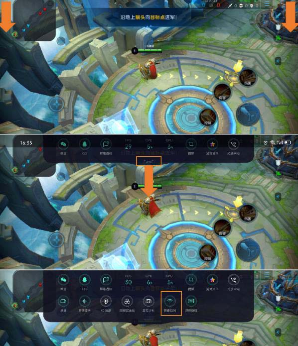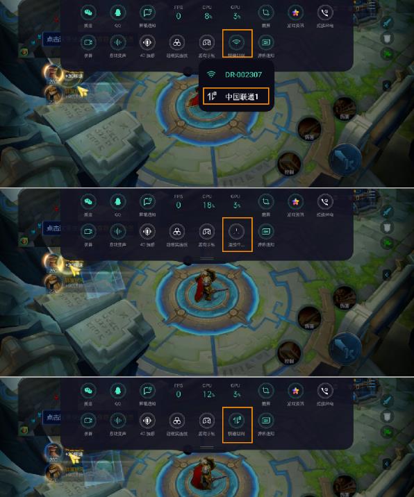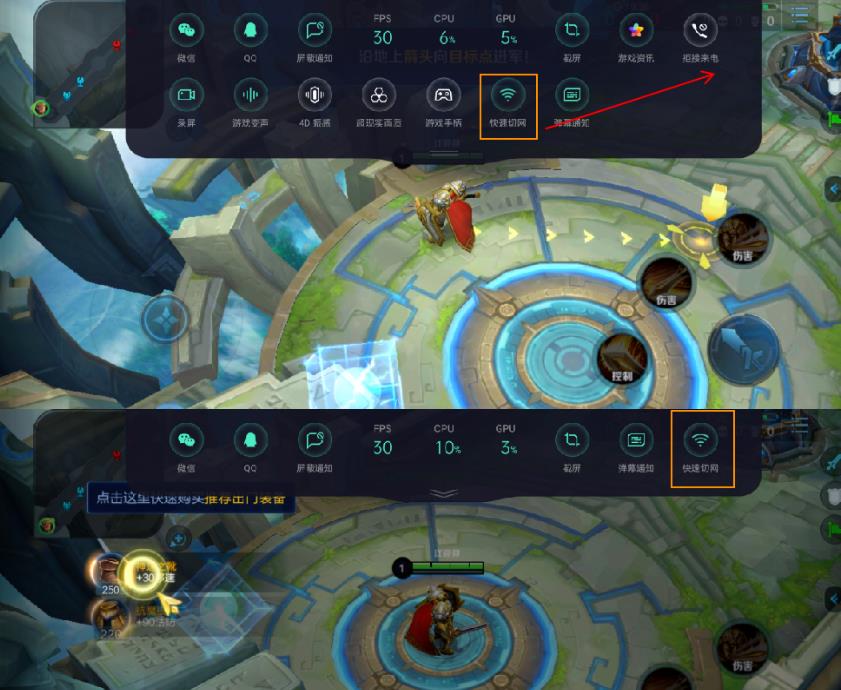 2、在游戲界面,通過右上角(或左上角)下拉喚出游戲助手—再次下拉打開二級(jí)菜單—點(diǎn)擊【快速切網(wǎng)】。