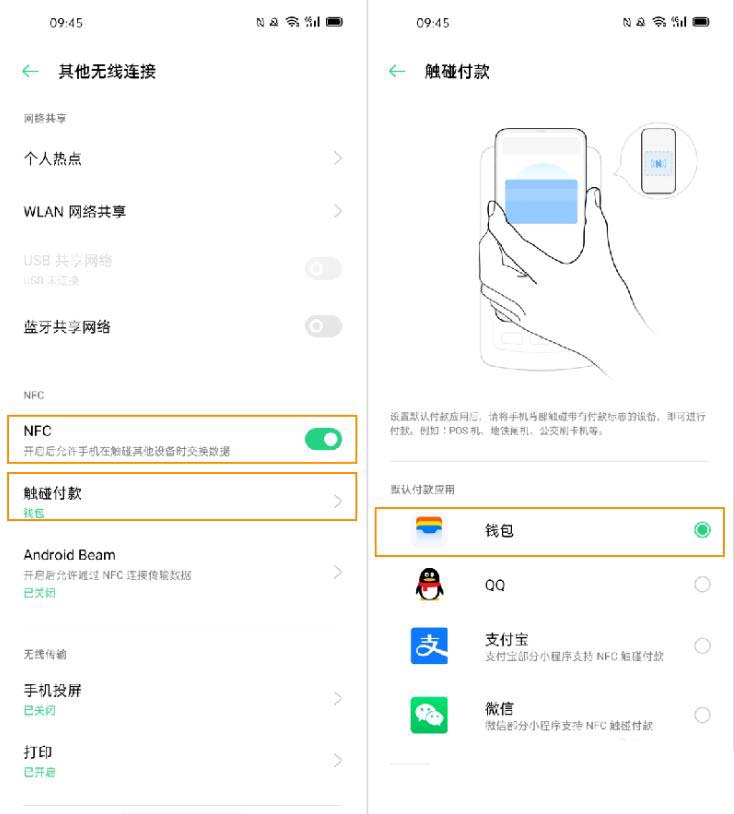 2、打開NFC開關(guān)—點(diǎn)擊【觸碰付款】—選擇【錢包】。