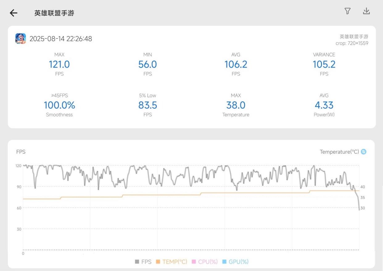在室溫26度的情況下,進行了兩局游戲,實測平均幀率105.2幀,玩起來的穩(wěn)定性一般,但是全程幀數(shù)基本都在100幀以上,功耗則是只有4.33W,核心溫度最高39.5°C,機身溫度不到40°C,手感相當舒適。