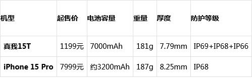 從表格對比可以看出,真我15T在電池容量、防護等級和厚度方面都優(yōu)于iPhone 15 Pro,而價格僅為后者的15%。