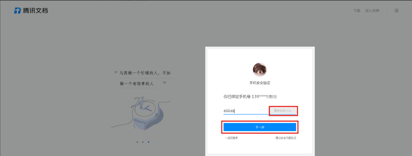 2)在手機(jī)安全驗證界面,「 獲取驗證碼 」,填寫后點擊「 下一步 」;