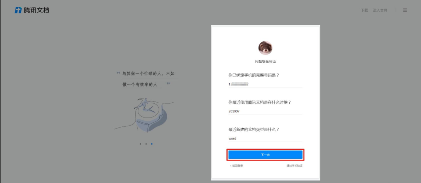 或點擊「 通過安全問題驗證 」,回答安全問題,點擊「 下一步 」;