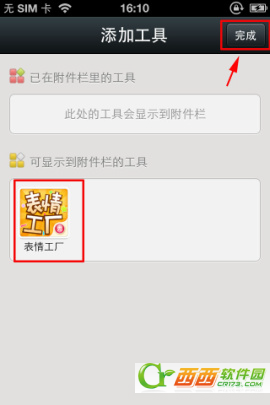 2)在可顯示到附件欄的工具點(diǎn)擊表情工廠(chǎng)然后點(diǎn)完成,再點(diǎn)擊添加到附件欄中。(如下圖所示)
