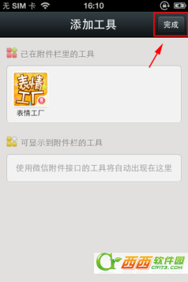 3)在附件欄里的工具中點(diǎn)擊表情工廠(chǎng),最后點(diǎn)擊完成,這樣你的微信附件欄里表情工廠(chǎng)就添加成功了。