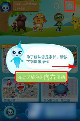 1)安裝并打開愛奇藝動畫屋,在主界面中點擊【齒輪】按提示輕觸對話框向右滑動。(如下圖)