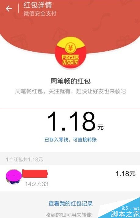 3、關(guān)注成功,第一時間接到公眾號發(fā)送的消息,點擊“領(lǐng)取現(xiàn)金紅包吧”。隨即窗口提示領(lǐng)取到的金額,這里1.18.可以返工到我的零錢包中查看該紅包哦。