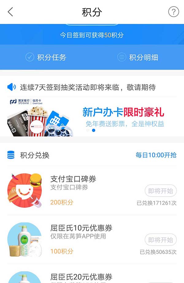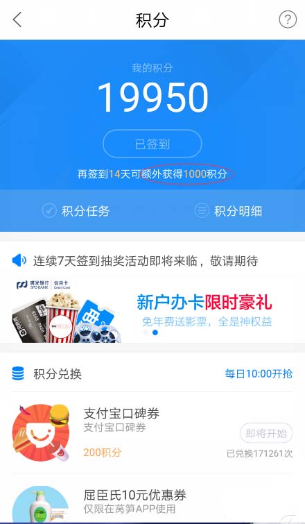 2、然后點積分頁面上的“簽到”,即可獲得50積分/每天;連續(xù)簽到滿15天后可獲得額外1000積分。