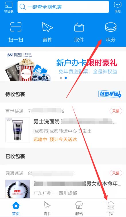 1、打開菜鳥裹裹APP,先說說簽到。在菜鳥裹裹首頁可點右下方的“我”,再點個人主頁上的“積分”;或者直接在首頁點右上方的“積分”,進入簽到頁面;