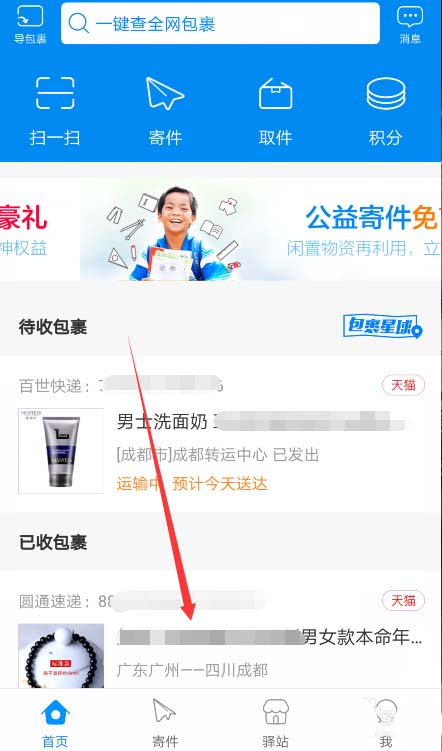 注:如果已將“已收包裹”里的包裹訂單刪除,可在首頁點右上角的消息里,找到對應(yīng)包裹提示點進詳情頁(刪除后不可恢復(fù))。