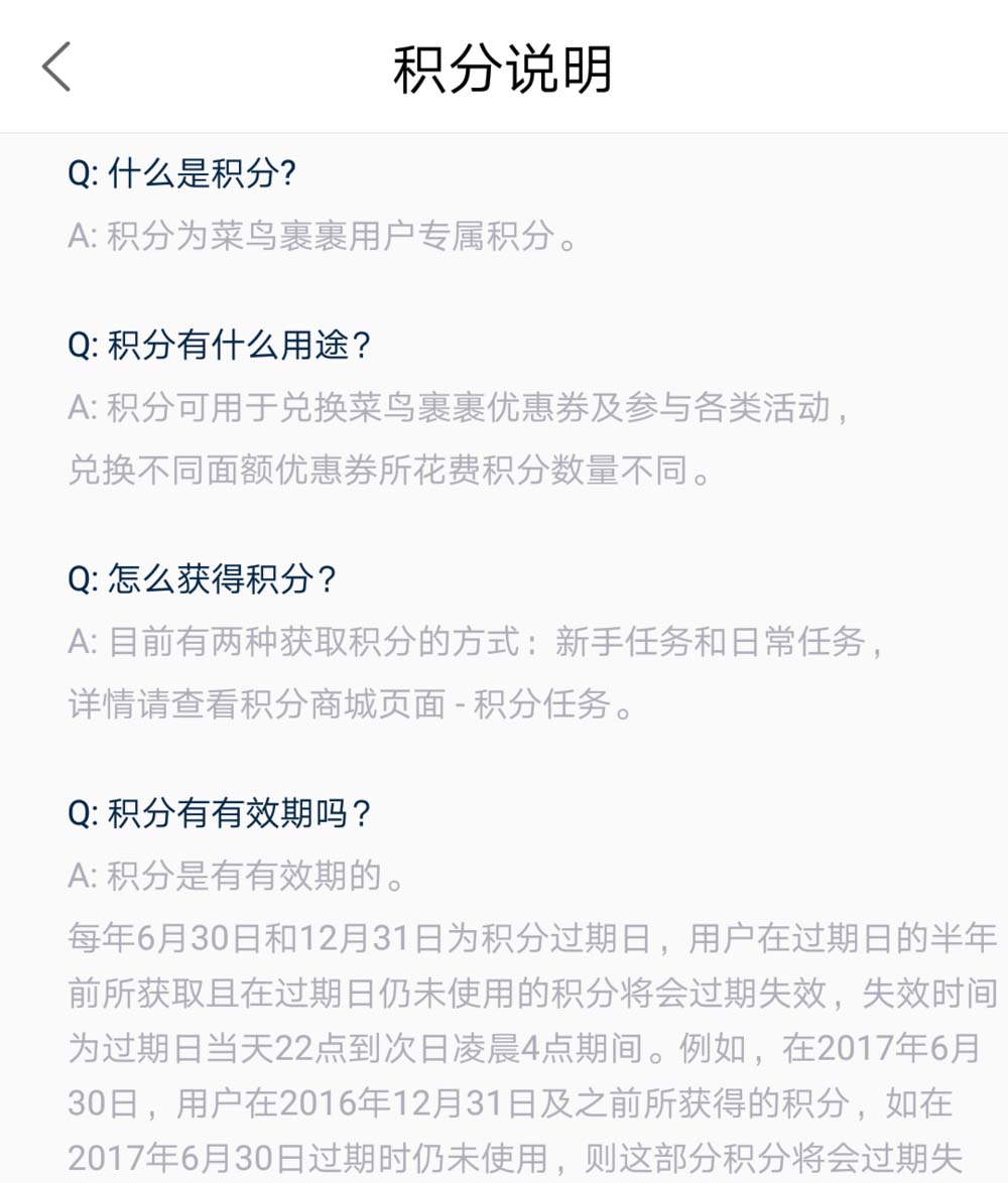 4、菜鳥裹裹的積分,可在積分獲取任務(wù)列表中查看,新手任務(wù)積分是一次性獲取的;日常任務(wù)可重復(fù)完成,只是各任務(wù)每天可獲得的積分有一定限制,具體可見任務(wù)說明。