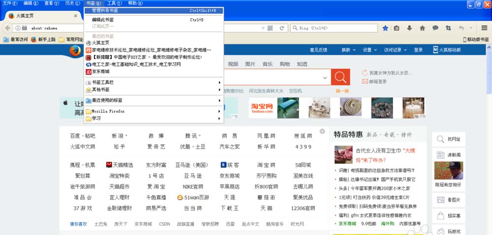 1、打開火狐瀏覽器,點(diǎn)擊書簽--管理所有書簽,如下圖。