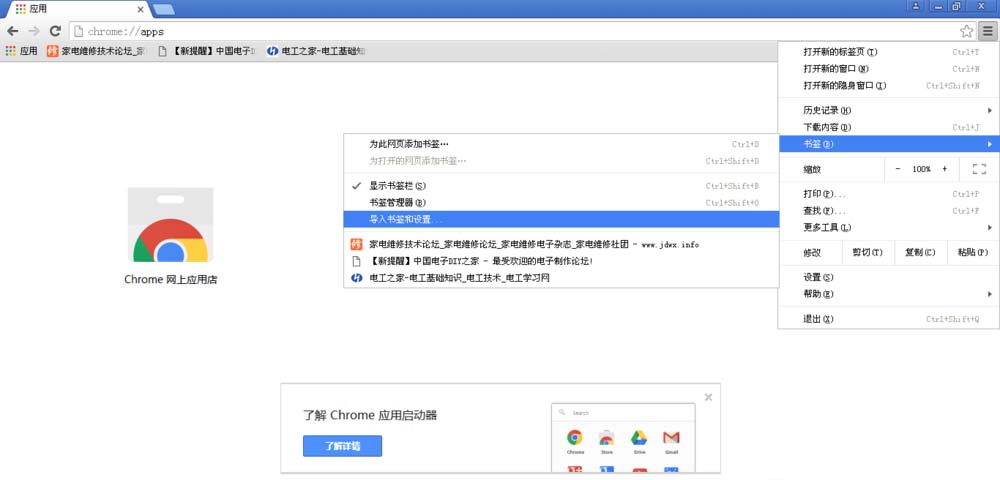 5、打開谷歌瀏覽器,點(diǎn)擊書簽---導(dǎo)入書簽和設(shè)置,如下圖。