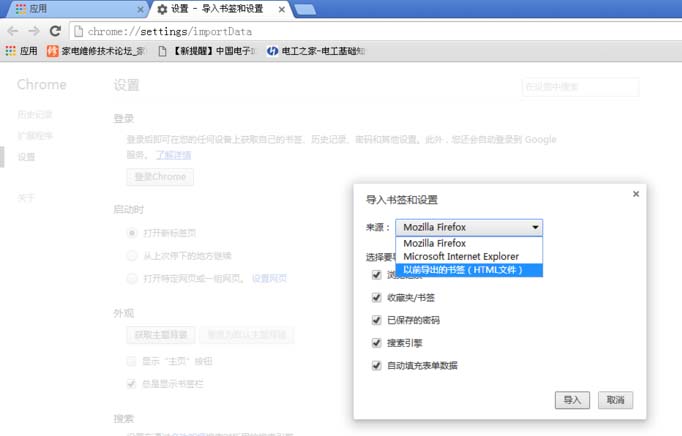 6、在來源中,設(shè)置為以前導(dǎo)出的書簽(html文件),點(diǎn)擊導(dǎo)入即可。如下圖。
