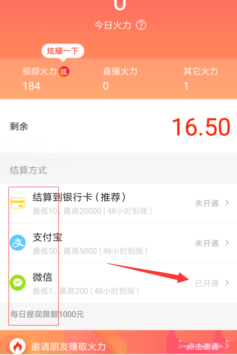 3、這個(gè)是我們剩余的沒有提現(xiàn)的火力,然后下方有三種提現(xiàn)方式,支付寶,銀行卡和微信,有不同的金額要求。