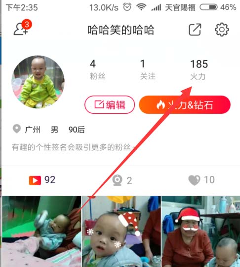2、這個(gè)界面查看自己發(fā)布的視頻和自己的個(gè)人資料,點(diǎn)擊上方的火力,如圖所示。