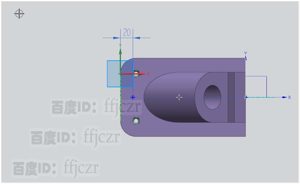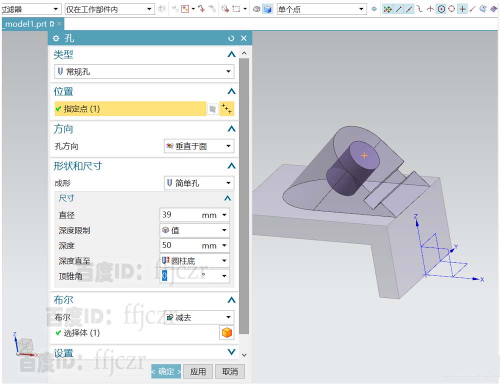 6、用孔命令,以上步倒圓所形成的圓心為開孔的定點(diǎn),開出一個(gè)直徑為39深50的平頭孔。給整體模型的四個(gè)角進(jìn)行倒R25的圓角,為下一步做好參考。