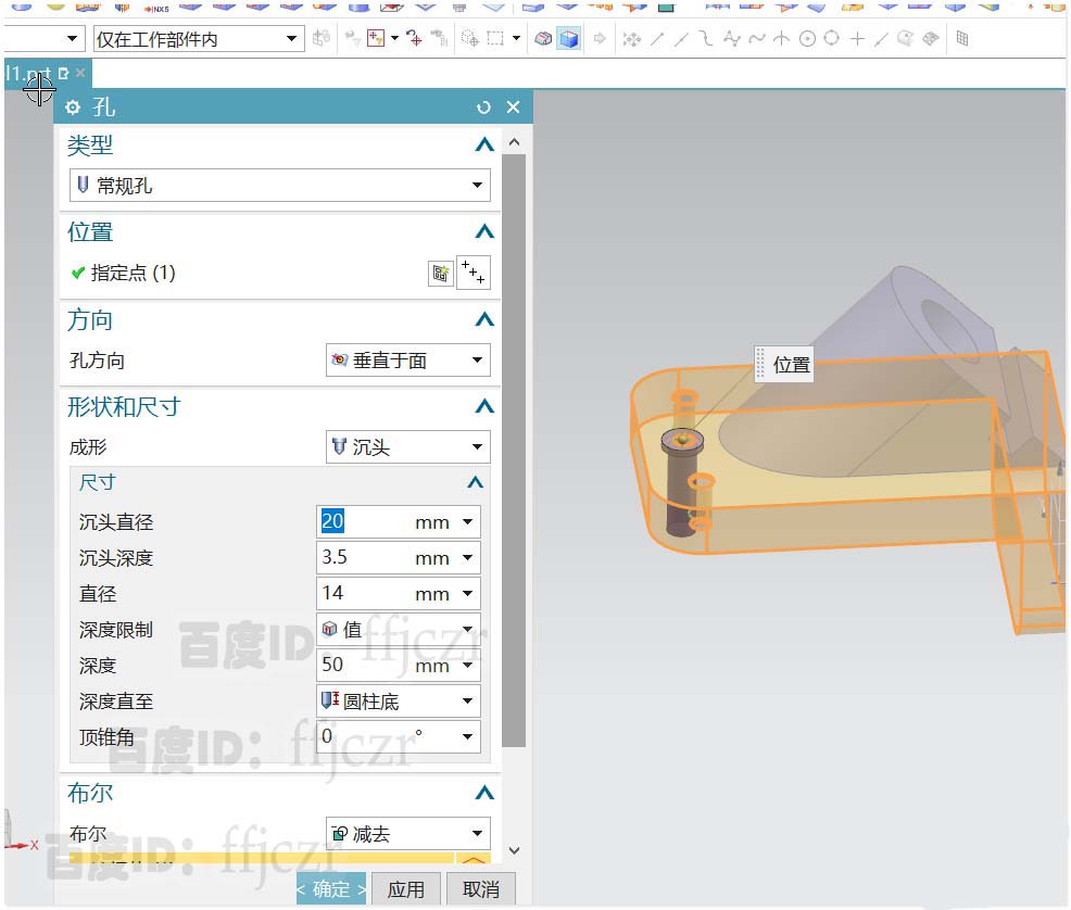 8、選用開孔命令,進(jìn)入草圖模式對(duì)開孔的點(diǎn)進(jìn)行定位,數(shù)值如圖所示;完成點(diǎn)的定位后,回到孔對(duì)話框,修改參數(shù):成形類型為沉產(chǎn)學(xué)研,大直徑為:20,深度3.5,孔直徑為14.確定后得到相應(yīng)的沉頭孔。