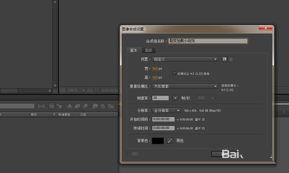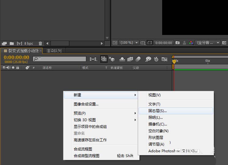 1、CTRL+N新建一個合成,命名為裂變式加載小動效,右擊時間線新建一個固態(tài)層。