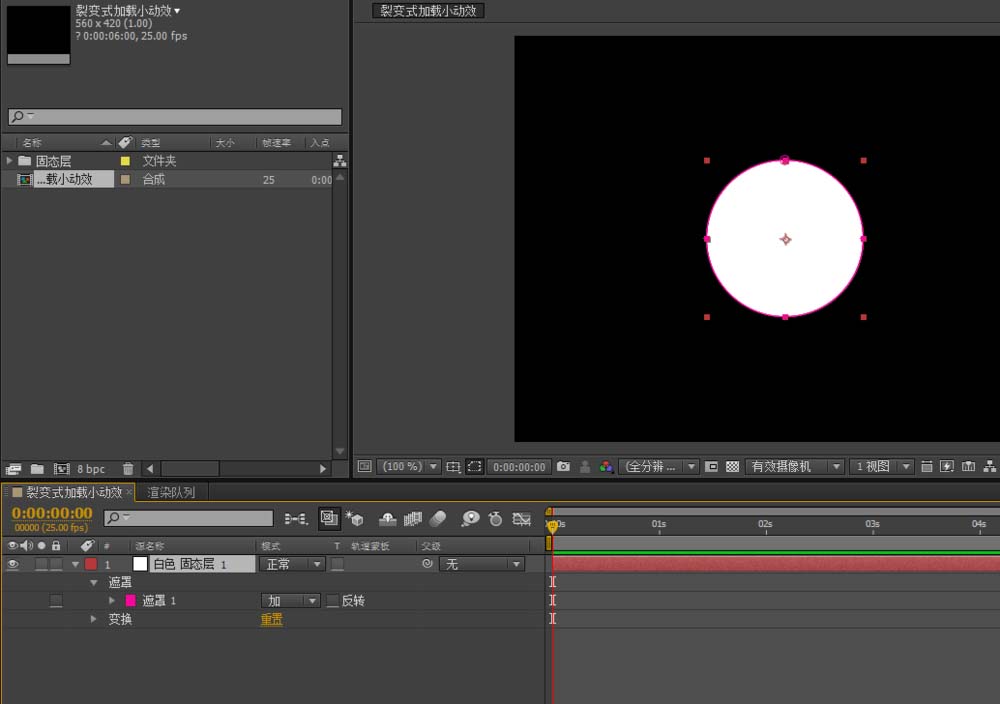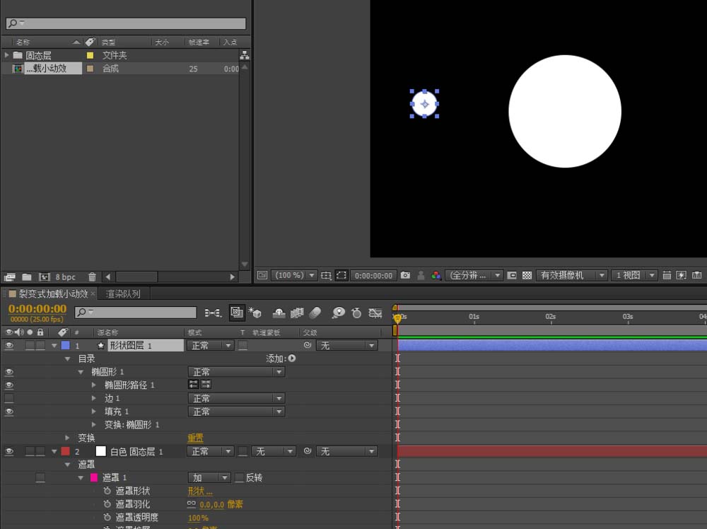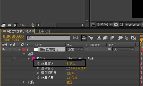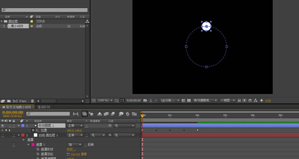 3、展開遮罩下拉,選中遮罩形狀,CTRL+C復(fù)制路徑,然后選中圓形圖形圖層P鍵打開位置屬性,CTRL+V黏貼路徑,同時關(guān)閉固態(tài)圖層,這里固態(tài)層起到一個路徑過度作用。