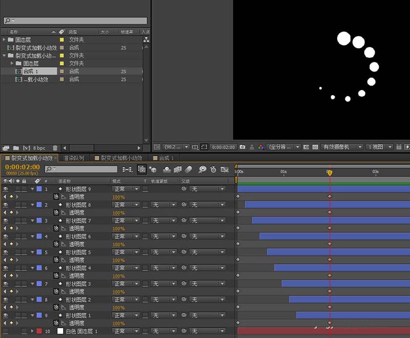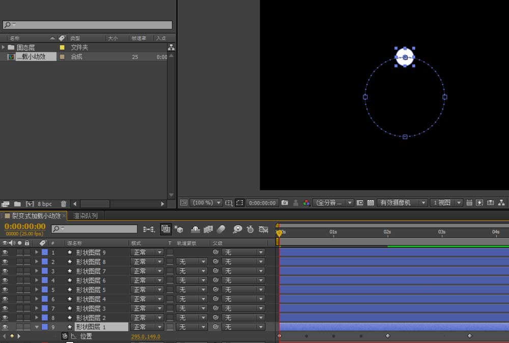 4、這個時候剛剛固態(tài)圖層所畫的路徑就連同關(guān)鍵幀一起復(fù)制到小圓上了,選中形狀圖層,CTRL+D復(fù)制9個圖層。