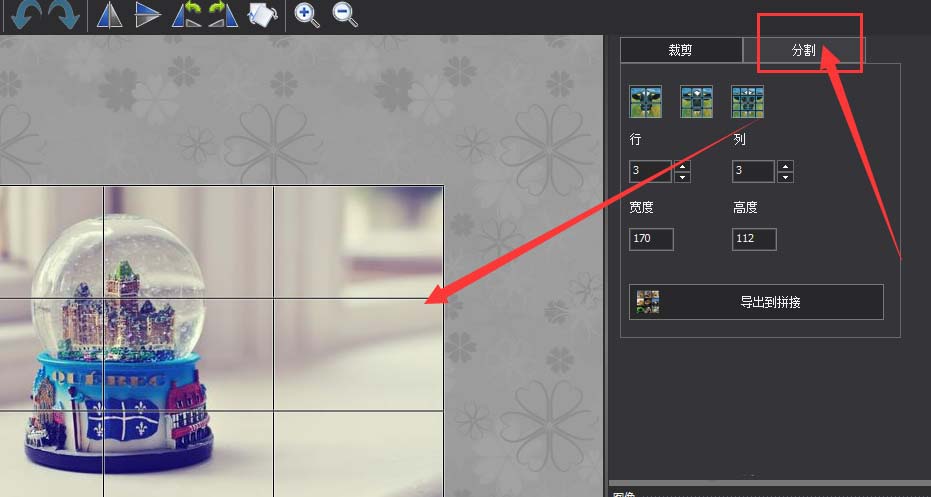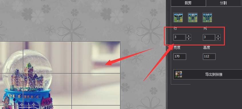 4、在下面可以調(diào)整分割的行、列數(shù)值,調(diào)整好數(shù)值后,在左側(cè)圖片上會直接出現(xiàn)裁切線