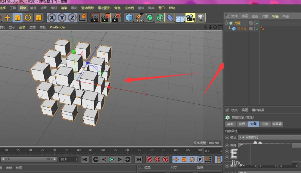 2、在克隆屬性中,添加網(wǎng)格排列屬性設(shè)置,如圖;然后再在底部建立一個平面
