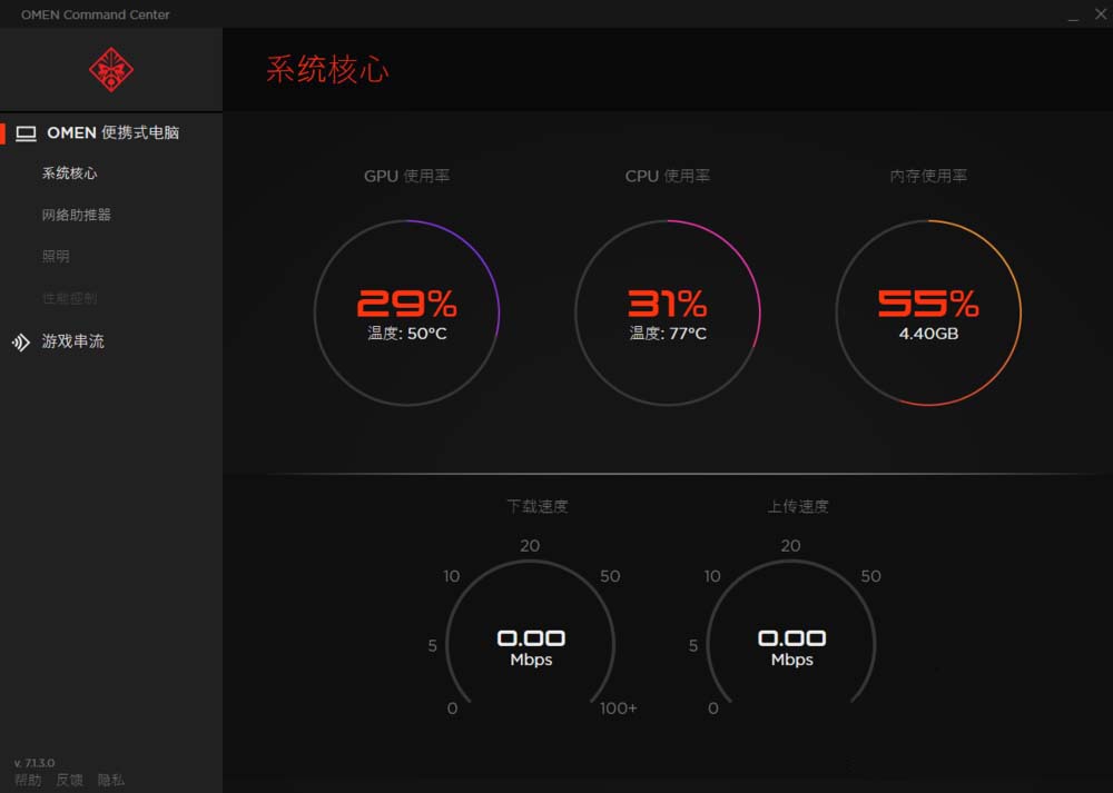 2、之后會彈出如下圖這樣的窗口。我們可以看到,這是惠普官方為暗影精靈系列筆記本專門設(shè)計的性能控制中心。這里不僅可以調(diào)節(jié)風(fēng)扇轉(zhuǎn)速,即散熱效果,還可以調(diào)節(jié)鍵盤背光和網(wǎng)速流量等。