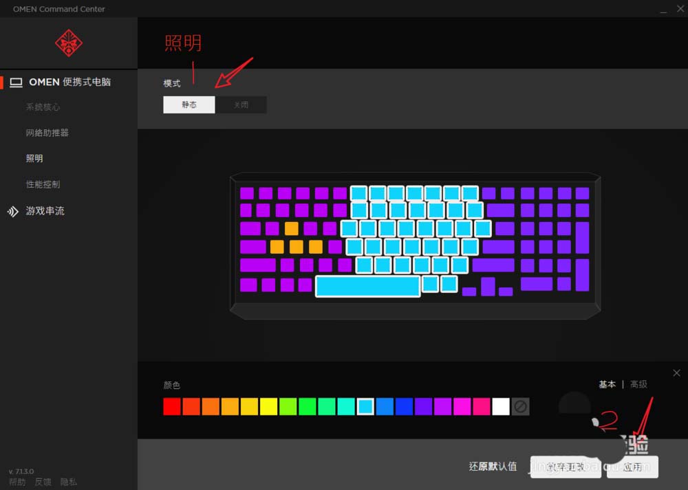 4、此時我們只需將燈光開關(guān)調(diào)節(jié)成靜態(tài),再點擊應(yīng)用即可。如圖中所標注步驟。