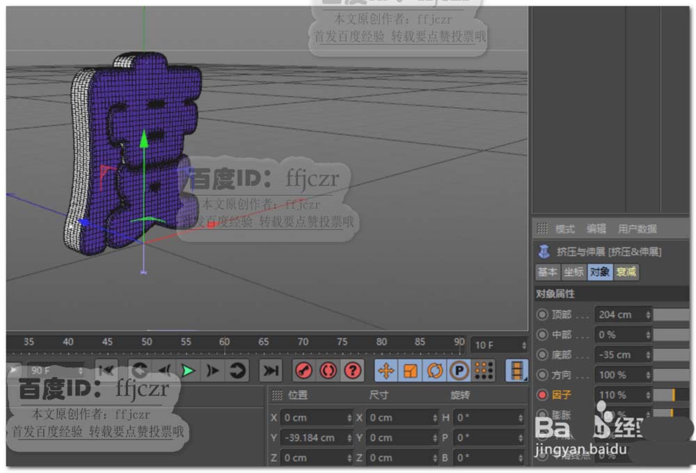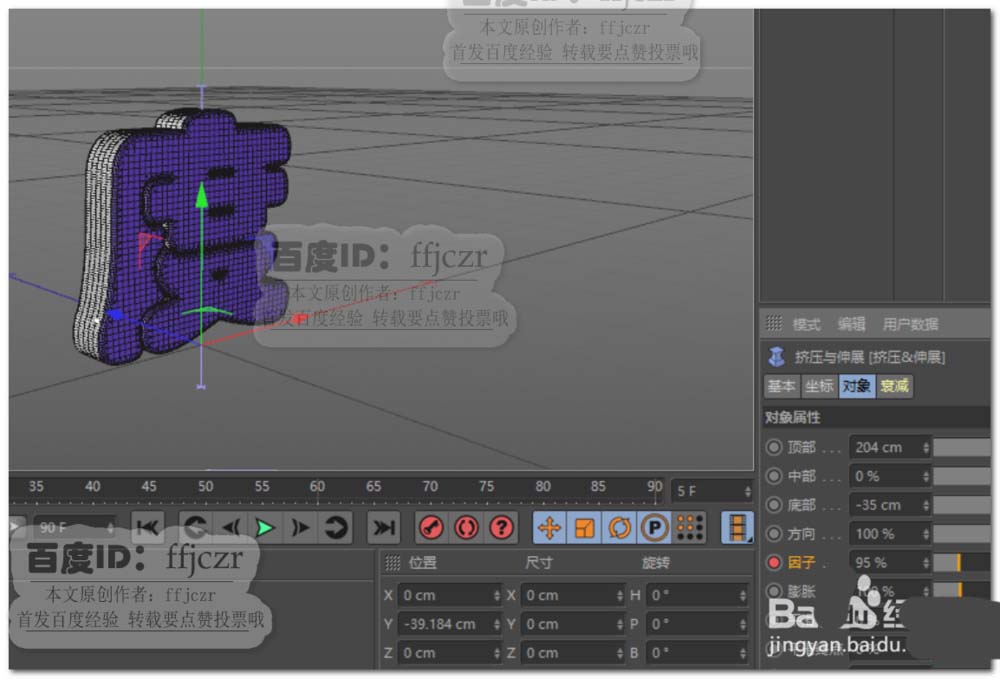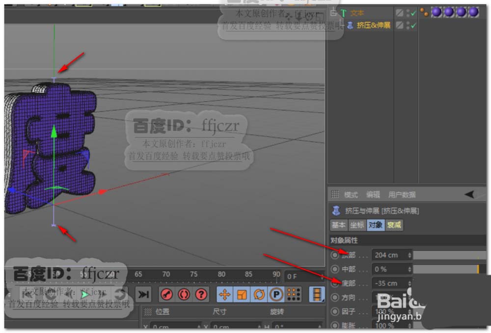 3、給文本添加一個擠壓&伸展變形器。調(diào)整變形器屬性中的頂部與底部,使變形器將文字包含其中。