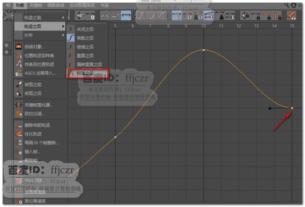 6、在彈出的動畫函數(shù)曲線中,選擇曲線最后一個點。點開功能菜單,選擇軌跡之后振蕩。