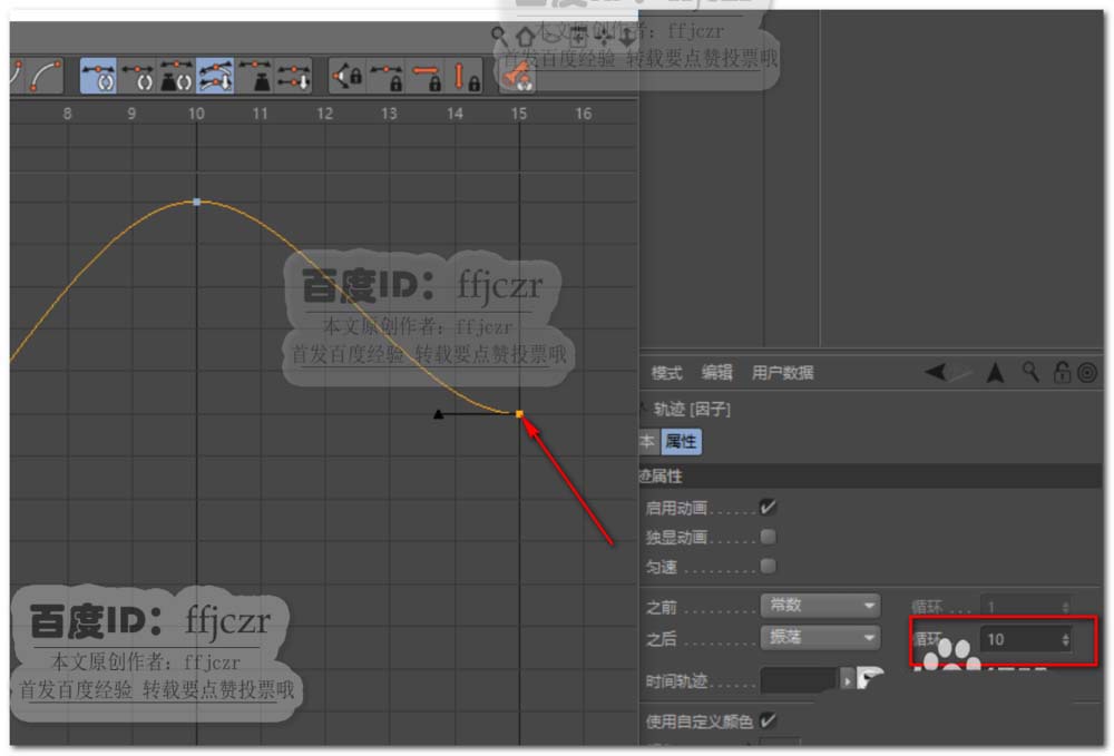 7、使函數(shù)曲線的因子選項處于選中狀態(tài),更改軌跡因子屬性面板:之后,振蕩的循環(huán)數(shù)值為:10。這樣就可以讓文字一直處于呼吸的狀態(tài)了。