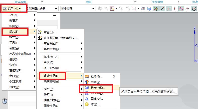 2、如下圖所示。執(zhí)行【菜單——插入——設(shè)計(jì)特征——長(zhǎng)方體】,激活長(zhǎng)方體命令。