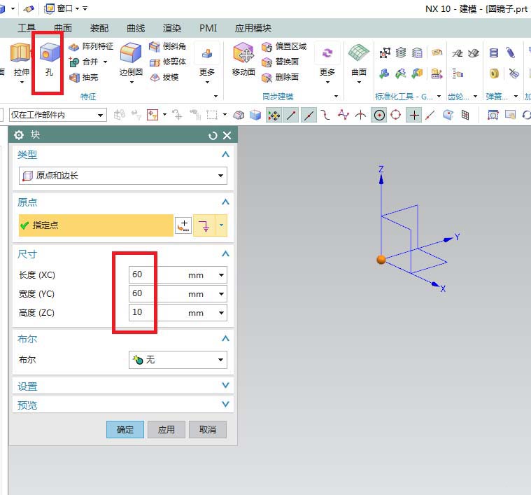 3、如下圖所示,軟件彈出一個(gè)“塊”對(duì)話框,指定點(diǎn)默認(rèn)為原點(diǎn)坐標(biāo),設(shè)置詳細(xì)尺寸:60x60x10,點(diǎn)擊確定。