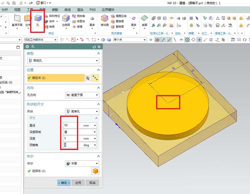 4、如下圖所示,點(diǎn)擊工具欄中的“孔”圖標(biāo),及該命令,然后位置指定點(diǎn),指定為長(zhǎng)方體上平面的中點(diǎn),然后設(shè)置詳細(xì)尺寸,直徑:50,深度5,頂錐角:0,點(diǎn)擊確定。這個(gè)圓孔是鑲嵌圓鏡片的。