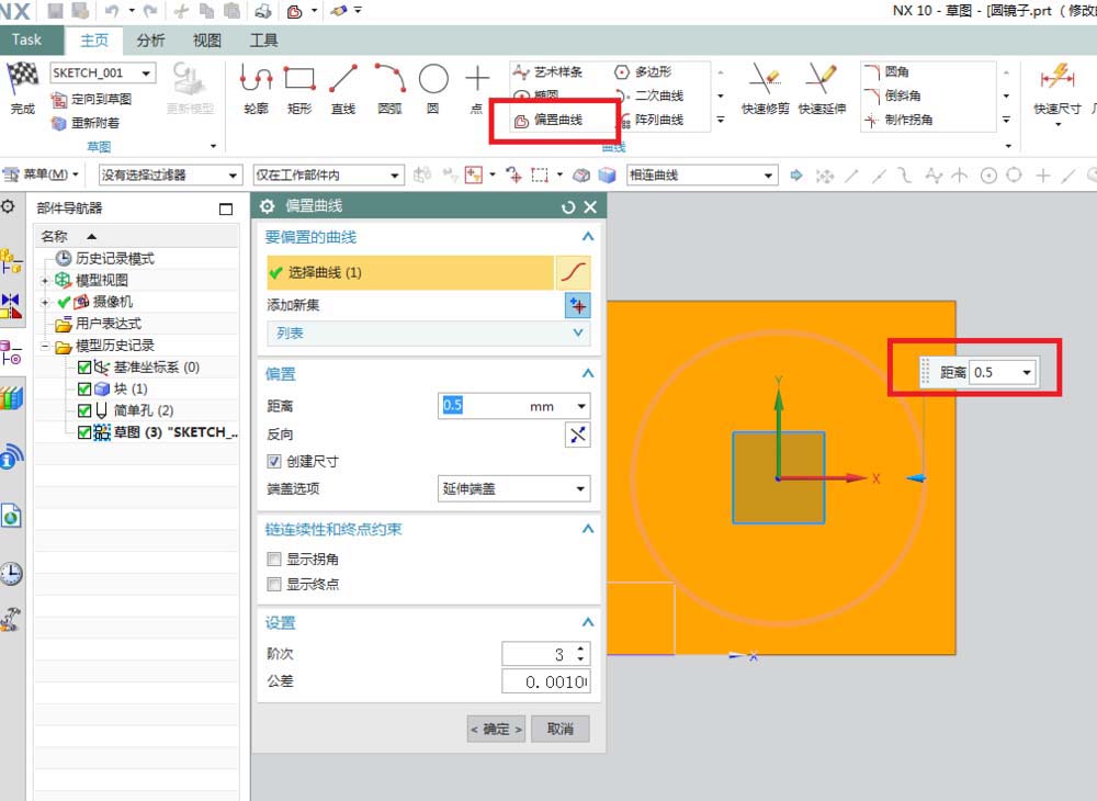 6、如下圖所示,進(jìn)入草圖,激活“偏置曲線”命令,然后將圓向內(nèi)偏移0.5,(這是為了后面渲染看到清楚,實(shí)際鑲嵌的時(shí)候是不能小,只能大的。)然后點(diǎn)擊完成,退出草圖。