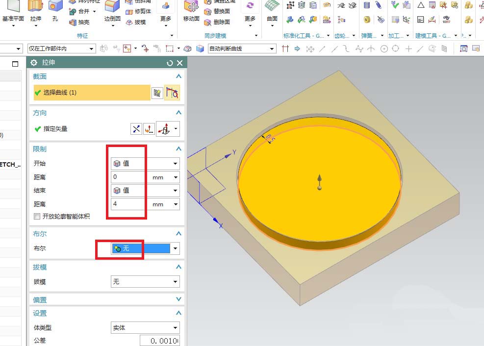 7、如下圖所示,回到拉伸對(duì)話框,設(shè)置詳細(xì)拉伸尺寸:拉伸高度4,布爾無(wú),點(diǎn)擊確定。